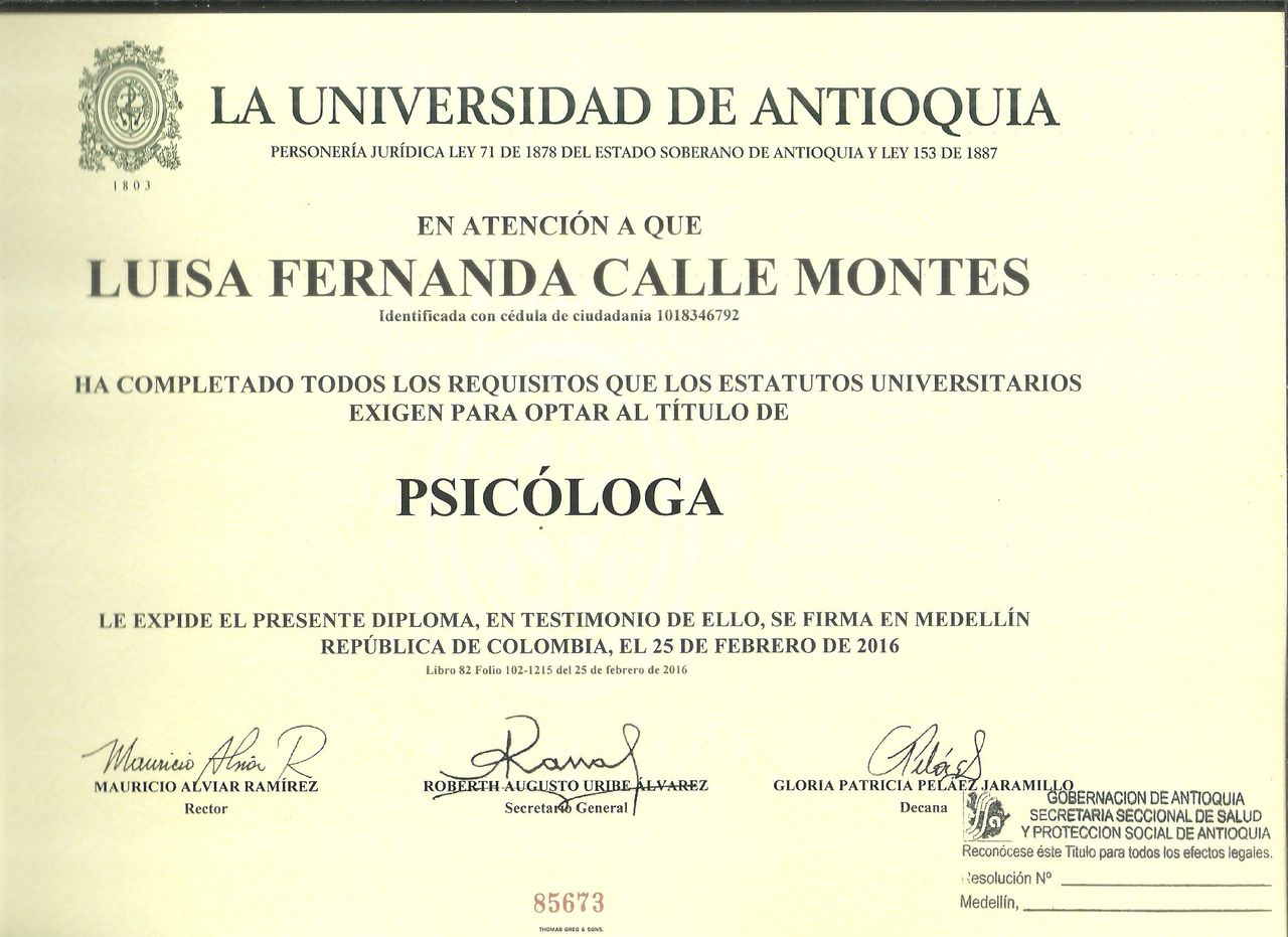 ¿Cuáles son las especialidades principales de Luisa Fernanda Calle Montes?Luisa Fernanda Calle Montes es Psicólogo. Te mostramos algunos de los servicios que ofrece gracias a su trayectoria y su amplia experiencia: Asesoría psicológica y psicoeducación, Capacitaciones empresariales, Salud mental empresarial, Grupos de apoyo, Psicoterapia Individual, Talleres grupales, Consulta psicológica por ansiedad, Consulta en línea.