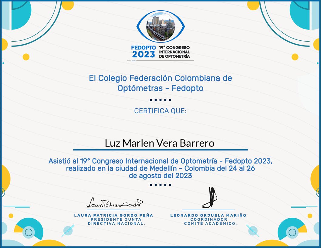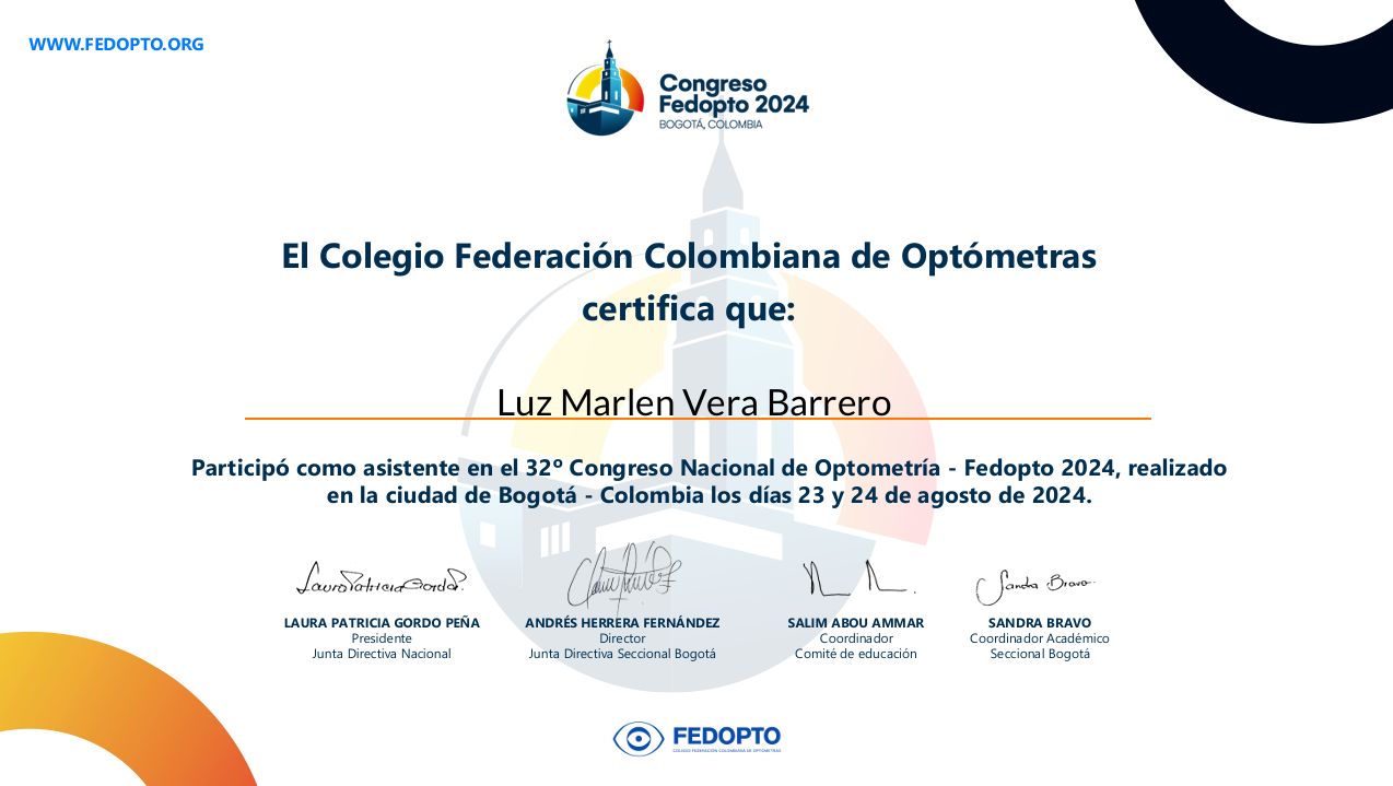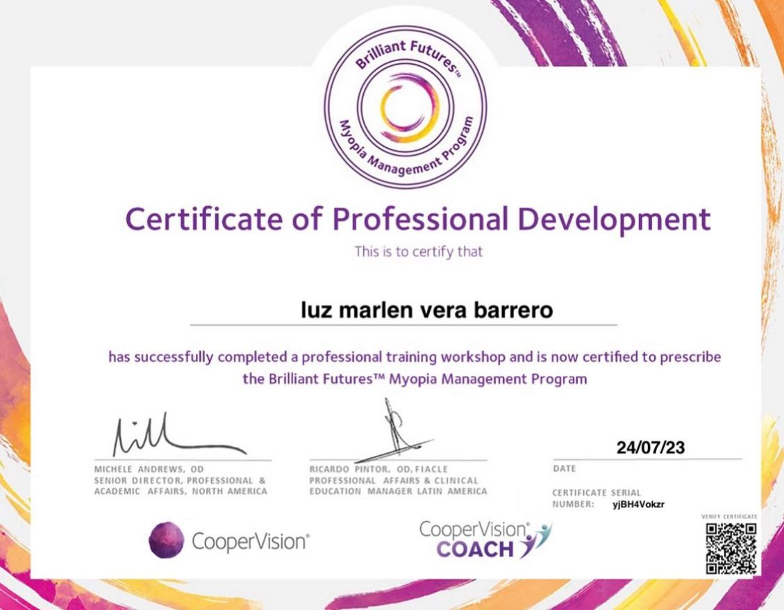 ¿Cuáles son las especialidades principales de Luz Marlen Vera Barrero?Luz Marlen Vera Barrero es Optómetra. Te mostramos algunos de los servicios que ofrece gracias a su trayectoria y su amplia experiencia: Visita Optometría, Adaptación de lentes de contacto, Consulta de optometría especializada, Certificado visual para colegios, Certificado visual para empresas, Control de miopía, Examen bajo cicloplejia, Consultoría para gestionar el bienestar ante los dispositivos digitales, realidad virtual y metaverso, Adaptación de lentes de contacto especiales, Asesoría en cirugía ocular y refractiva.