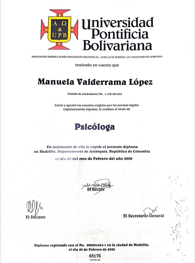 ¿Cuáles son las especialidades principales de Manuela Valderrama López?Manuela Valderrama López es Psicólogo. Te mostramos algunos de los servicios que ofrece gracias a su trayectoria y su amplia experiencia: Psicoterapia Individual, Consulta en Crisis, Consulta psicológica por ruptura amorosa, Consulta psicológica por duelo, Asesoría psicológica y psicoeducación, Pautas de crianza, Consulta psicológica por ansiedad, Visita Psicología, Manejo del duelo.