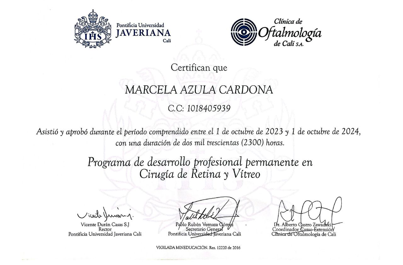 Soy médica oftalmóloga graduada de la Universidad Javeriana - Bogotá y supraespecialista en retina y vítreo de la Universidad Javeriana - Cali, con más de seis años de experiencia acompañando a mis pacientes en el cuidado de su salud visual.
