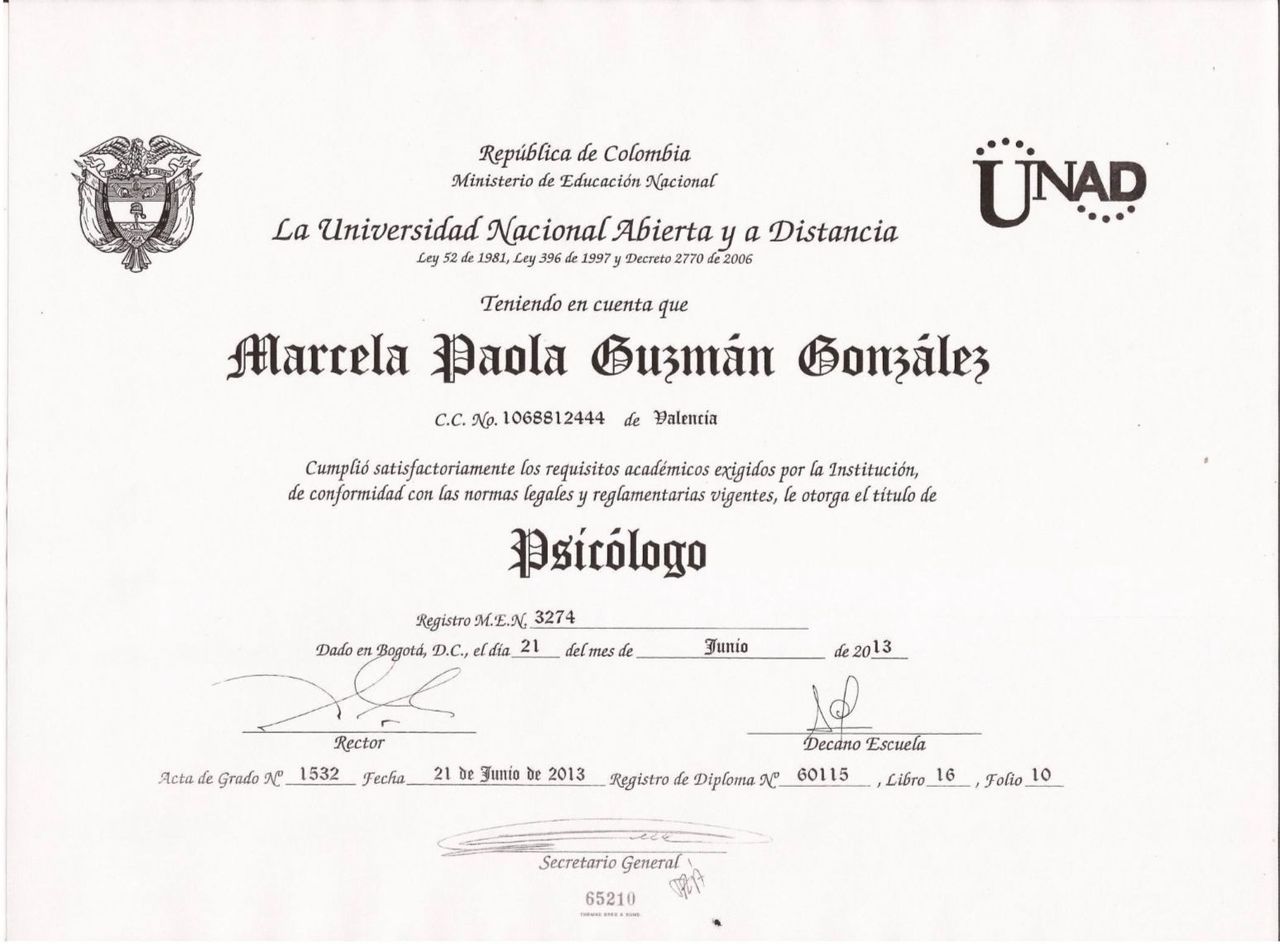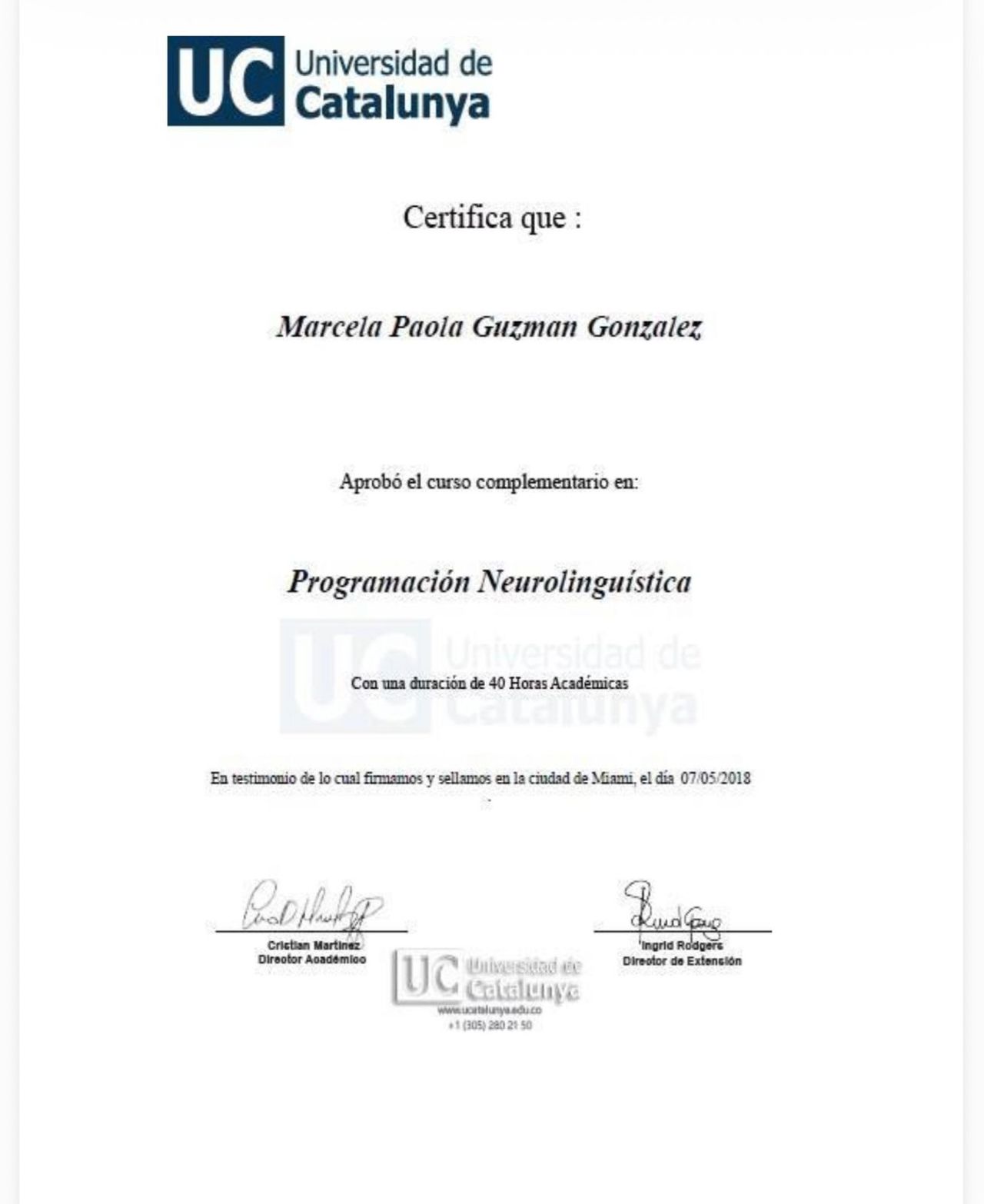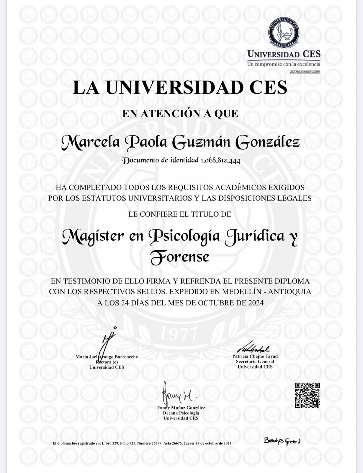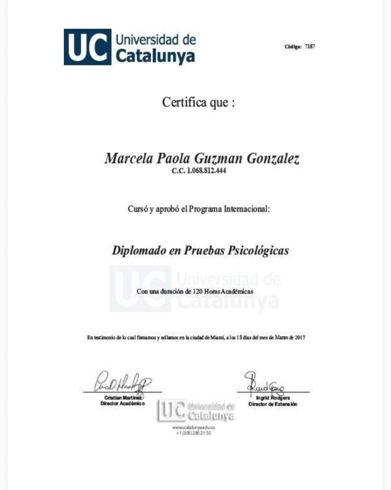 ¿Cuáles son las especialidades principales de Marcela Paola Guzmán González?Marcela Paola Guzmán González es Psicólogo. Te mostramos algunos de los servicios que ofrece gracias a su trayectoria y su amplia experiencia: Visita Psicología, Psicoterapia Individual, Terapia de pareja, Consulta en Crisis, Manejo en procesos de duelo, Consulta on line internacional, Consulta en línea.