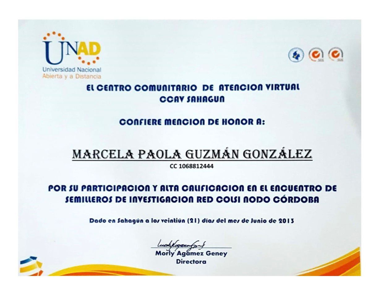 Recibí reconocimiento y mención de honor por mi compromiso, dedicación y excelencia académica clasificando para el semillero de investigación en Chile con el tema de “Inteligencia emocional desde la utilización de herramientas como el cine y el arte”