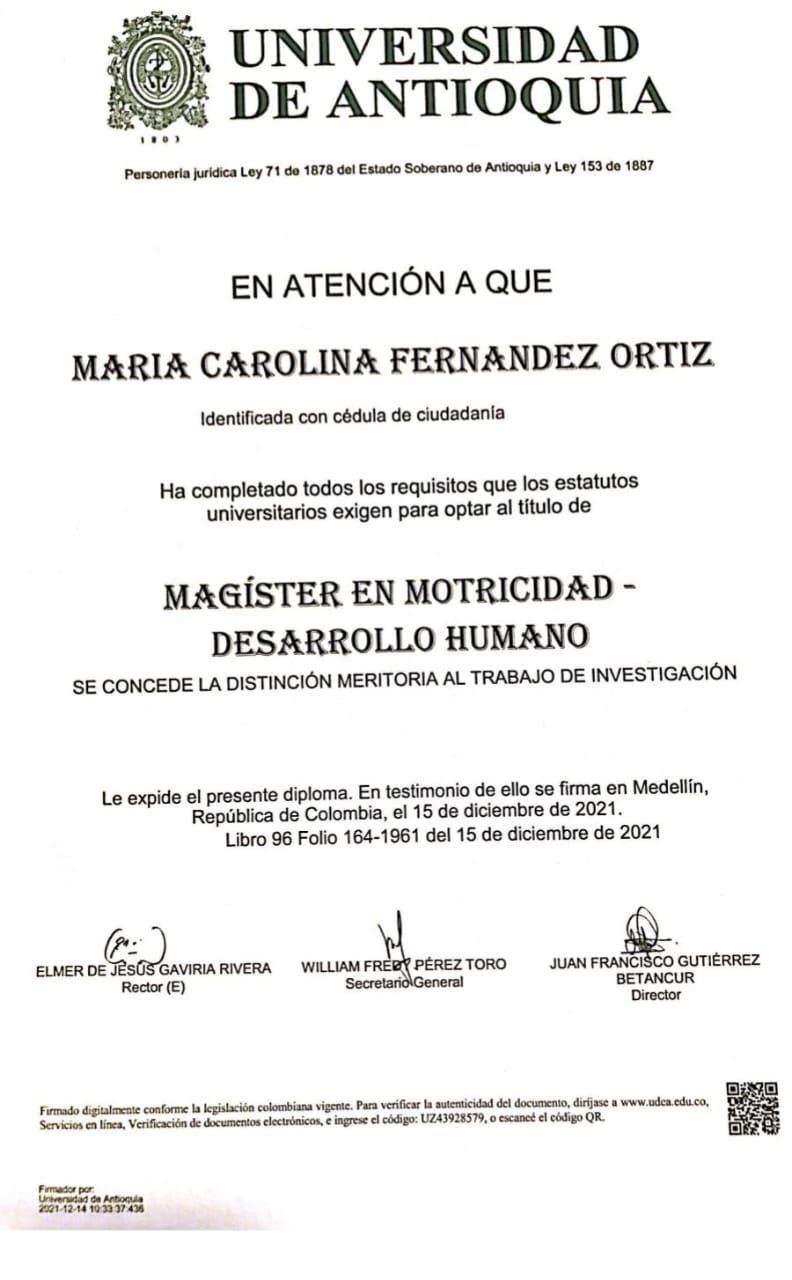 Psicóloga Cognitivo - Conductual, egresada de la Universidad de Antioquia y con experiencia en psicoterapia. Especialista en Administración de la Informática Educativa y Magister en Motricidad y Desarrollo Humano.