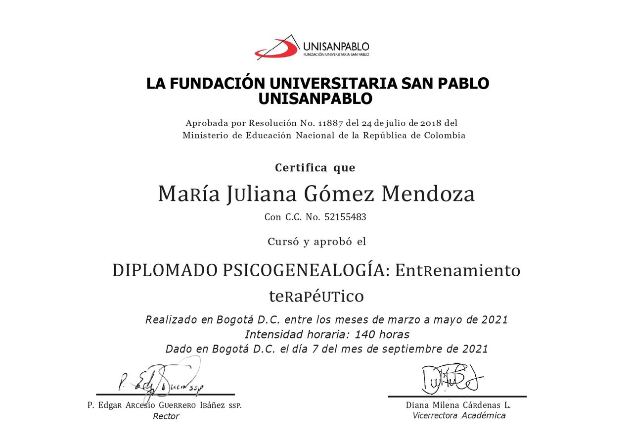 ¿Cuáles son las especialidades principales de Maria Juliana Gomez Mendoza?Maria Juliana Gomez Mendoza es Terapeuta complementario. Te mostramos algunos de los servicios que ofrece gracias a su trayectoria y su amplia experiencia: Psicoterapia Individual, Consulta de constelaciones familiares, Terapia de Constelaciones Familiares, Consulta en línea.