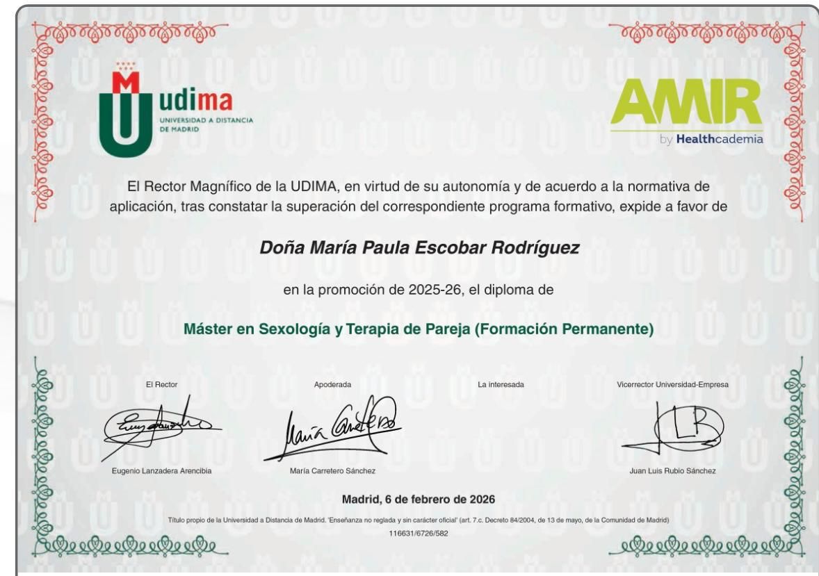 ¿Cuáles son las especialidades principales de Maria Paula Escobar?Maria Paula Escobar es Sexólogo, Médico general. Te mostramos algunos de los servicios que ofrece gracias a su trayectoria y su amplia experiencia: Consulta en línea, Consulta online sexología, Consulta por videollamada, Telemedicina, Terapia de pareja, Alteraciones del deseo Masculinas y Femeninas.