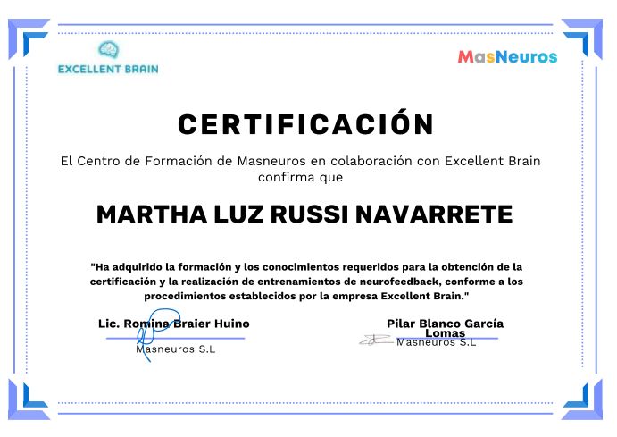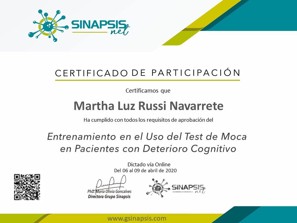 ¿Cuáles son las especialidades principales de Martha Luz Russi?Martha Luz Russi es Neuropsicólogo. Te mostramos algunos de los servicios que ofrece gracias a su trayectoria y su amplia experiencia: Neurofeedback, Rehabilitación neuropsicológica, Neurodesarrollo, Terapia a pacientes con TDAH, Evaluación Neuropsicológica Escolar, Consulta Control Neuropsicología, Entrega de resultados, Prueba cognitiva, Consulta neuropsicología control, Evaluación de las habilidades académicas.