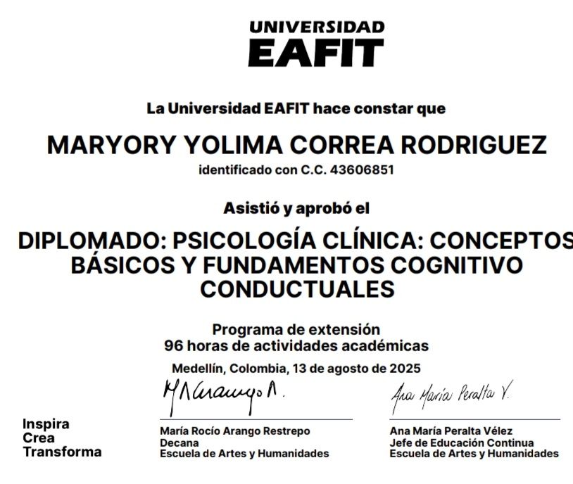 ¿Cuáles son las especialidades principales de Maryory Correa?Maryory Correa es Psicólogo. Te mostramos algunos de los servicios que ofrece gracias a su trayectoria y su amplia experiencia: Visita Psicología, Consulta en línea.