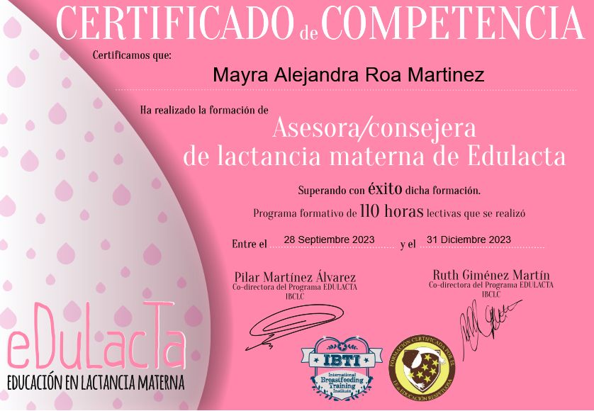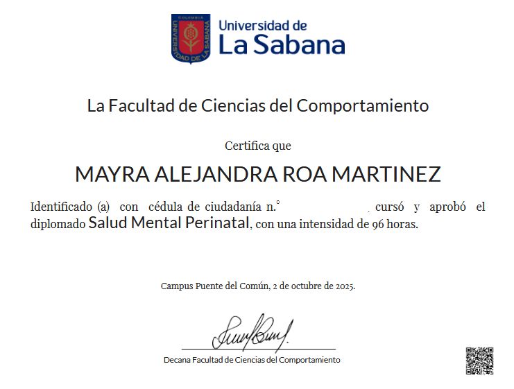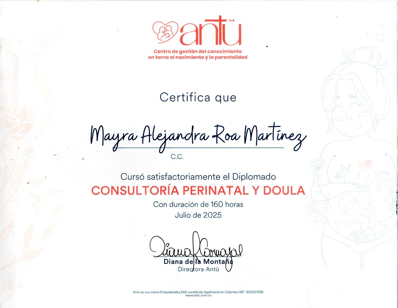 Soy Mayra Roa, psicóloga con enfoque en psicología perinatal, consultora perinatal, doula y asesora de lactancia materna. Acompaño a mujeres y familias durante el embarazo, el parto y el posparto, integrando el cuidado de la salud mental, el cuerpo y el vínculo temprano.