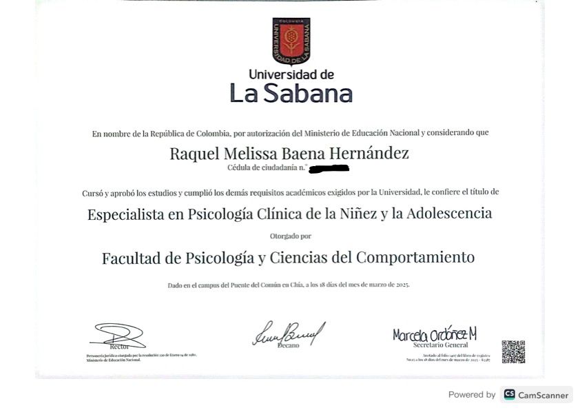 ¿Cuáles son las especialidades principales de Melissa Baena?Melissa Baena es Psicólogo. Te mostramos algunos de los servicios que ofrece gracias a su trayectoria y su amplia experiencia: Consulta psicológica infantil, Pautas de crianza, Psicoterapia Individual, Psicoterapia Infantil, Consulta psicológica adolescentes, Psicología para niños, adolescentes y adultos, Consulta psicológica online, Psicoterapia virtual, Consulta en línea.