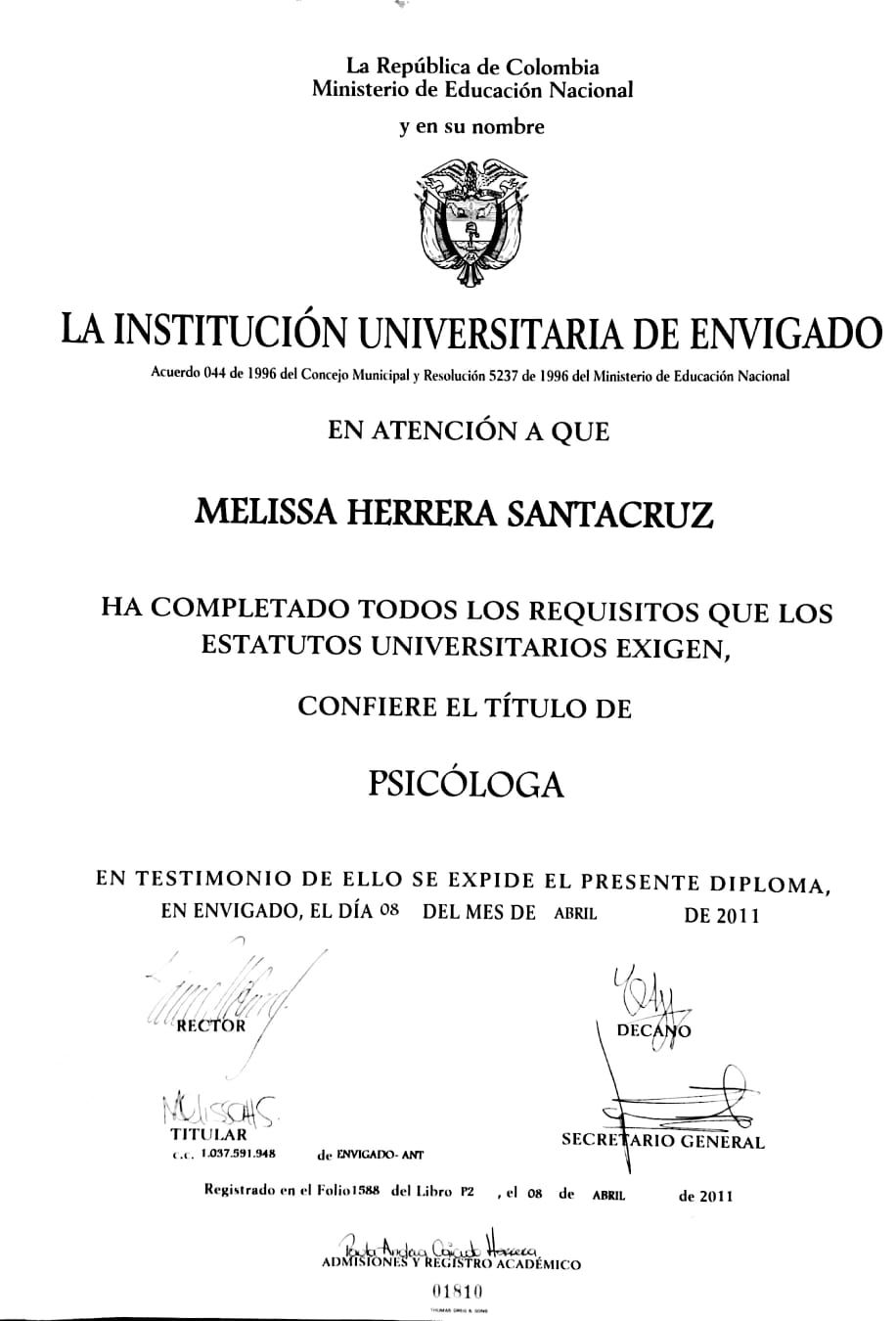 ¿Cuáles son las especialidades principales de Melissa Herrera Santacruz?Melissa Herrera Santacruz es Psicólogo. Te mostramos algunos de los servicios que ofrece gracias a su trayectoria y su amplia experiencia: Asesoría psicológica y psicoeducación, Consulta psicológica infantil, Pautas de crianza, Pruebas psicotécnicas, Rendimiento académico, Evaluación psicológica, Psicoterapia Infantil, Terapia familiar, Test de inteligencia, Evaluación Neuropsicológica.