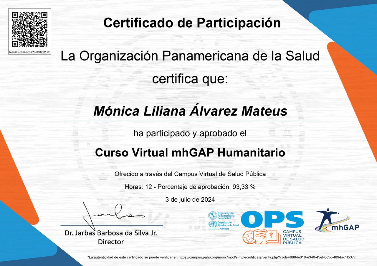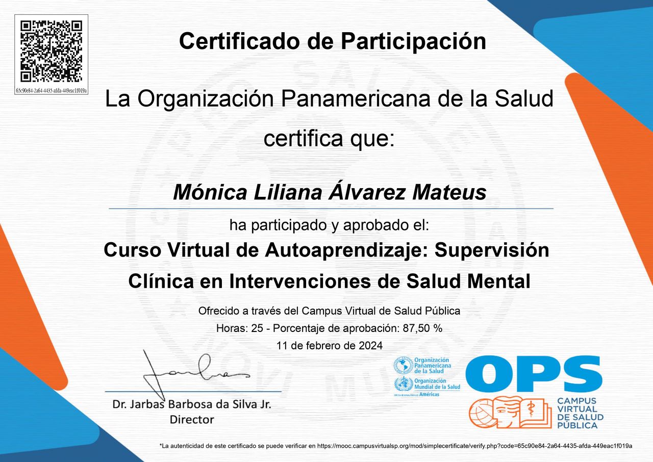 ¿Cuáles son las especialidades principales de Mónica Liliana Álvarez Mateus?Mónica Liliana Álvarez Mateus es Psicólogo. Te mostramos algunos de los servicios que ofrece gracias a su trayectoria y su amplia experiencia: Psicoterapia de pareja, Terapia de Constelaciones Familiares, Psicoterapia Individual, Consulta en línea, Consulta psicológica online, Consulta virtual de pareja, Psicoterapia virtual.
