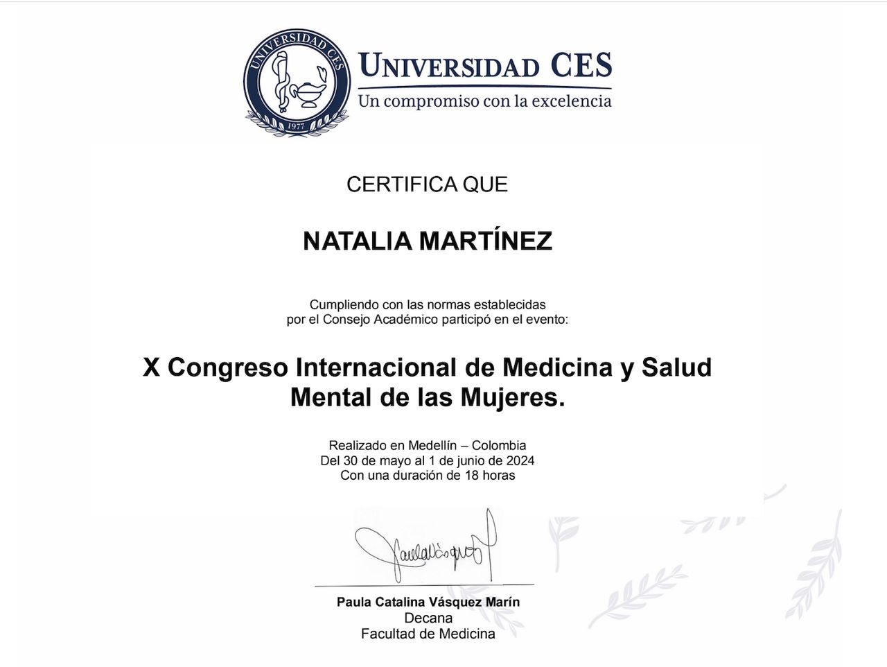 La doctora Natalia es una excelente profesional , demuestra gran conocimiento, dedicación y empatía Su atención es clara, humana ademas siempre se toma el tiempo para explicar y escuchar , me ayudó mucho en el caso de un familiar que está pasando una depresión por la pérdida de un ser querido .