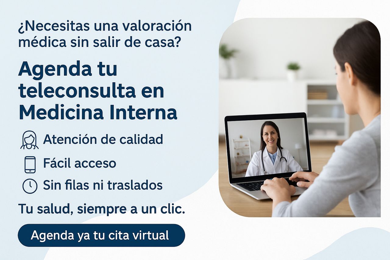 Con nuestra teleconsulta en Medicina Interna, puedes resolver tus dudas, hacer seguimiento a tus condiciones crónicas o recibir una orientación médica desde la comodidad de tu hogar.
