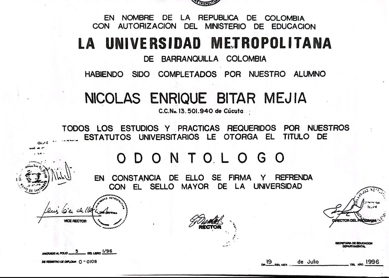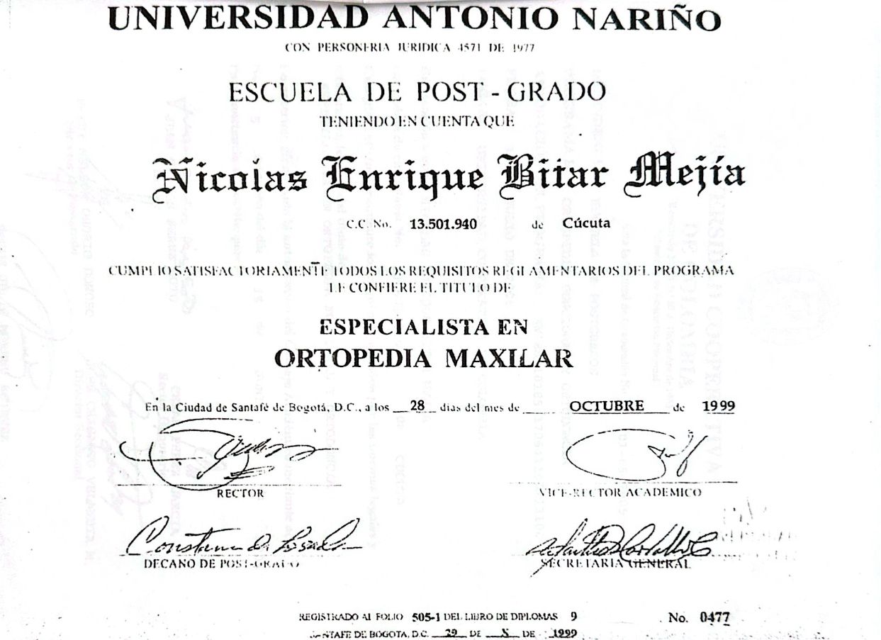 ¿Cuáles son las especialidades principales de Nicolas Enrique Bitar Mejia?Nicolas Enrique Bitar Mejia es Ortodoncista, Odontólogo. Te mostramos algunos de los servicios que ofrece gracias a su trayectoria y su amplia experiencia: Visita Odontología, Blanqueamiento dental, Diseño de sonrisa, Invisalign, Ortodoncia, Endodoncia, Rehabilitación Oral, Ortopedia maxilar, Cirugía Oral, Implantología.