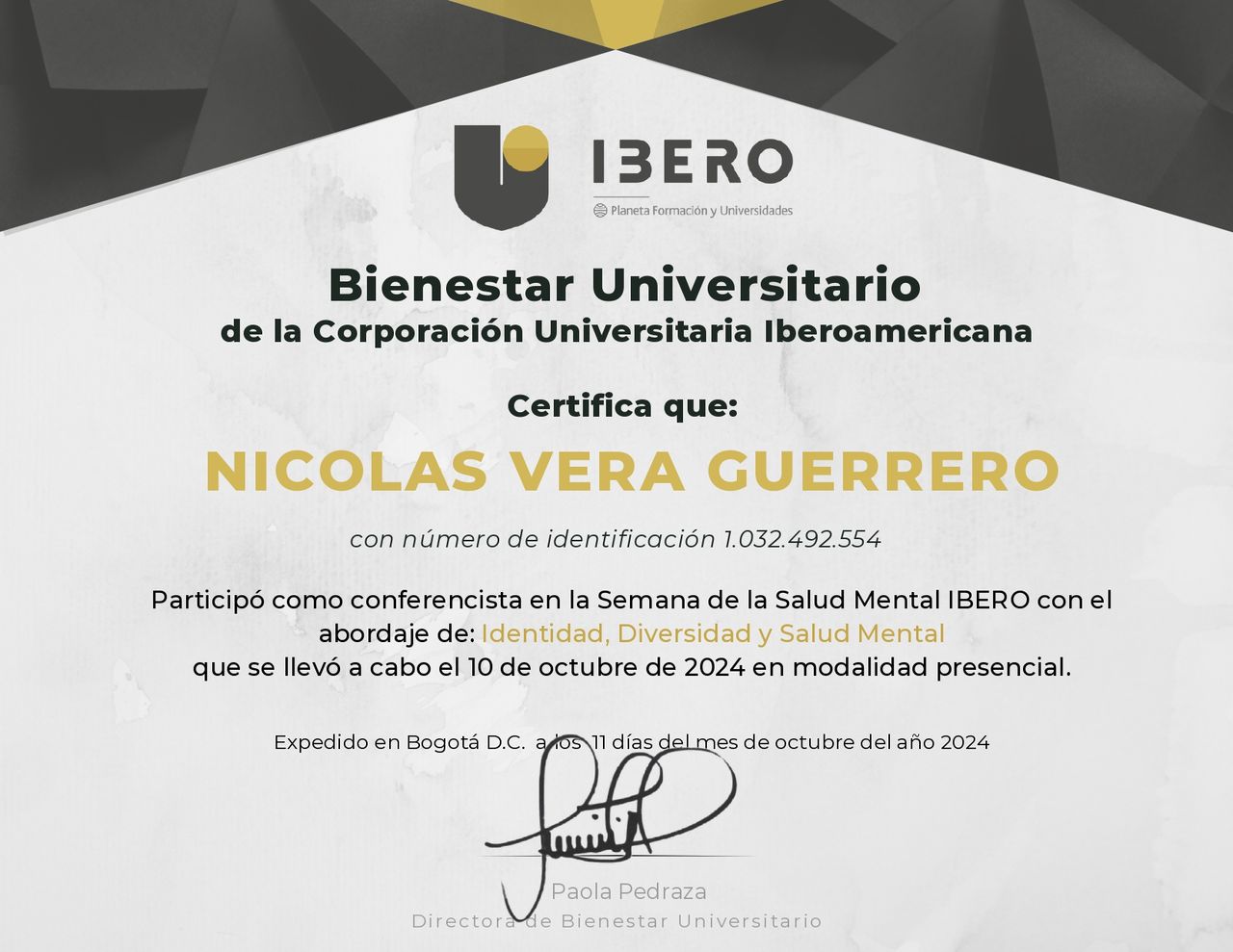 ¿Cuáles son las especialidades principales de Nicolas Vera Guerrero?Nicolas Vera Guerrero es Psicólogo. Te mostramos algunos de los servicios que ofrece gracias a su trayectoria y su amplia experiencia: Asesoría psicológica y psicoeducación, Capacitaciones empresariales, Coaching Familiar, Consulta psicológica infantil, Estudio y evaluación de riesgo psicosocial, Grupos de apoyo para pacientes con ansiedad, Pautas de crianza, Visita Psicología, Pruebas psicotécnicas, Salud mental empresarial.