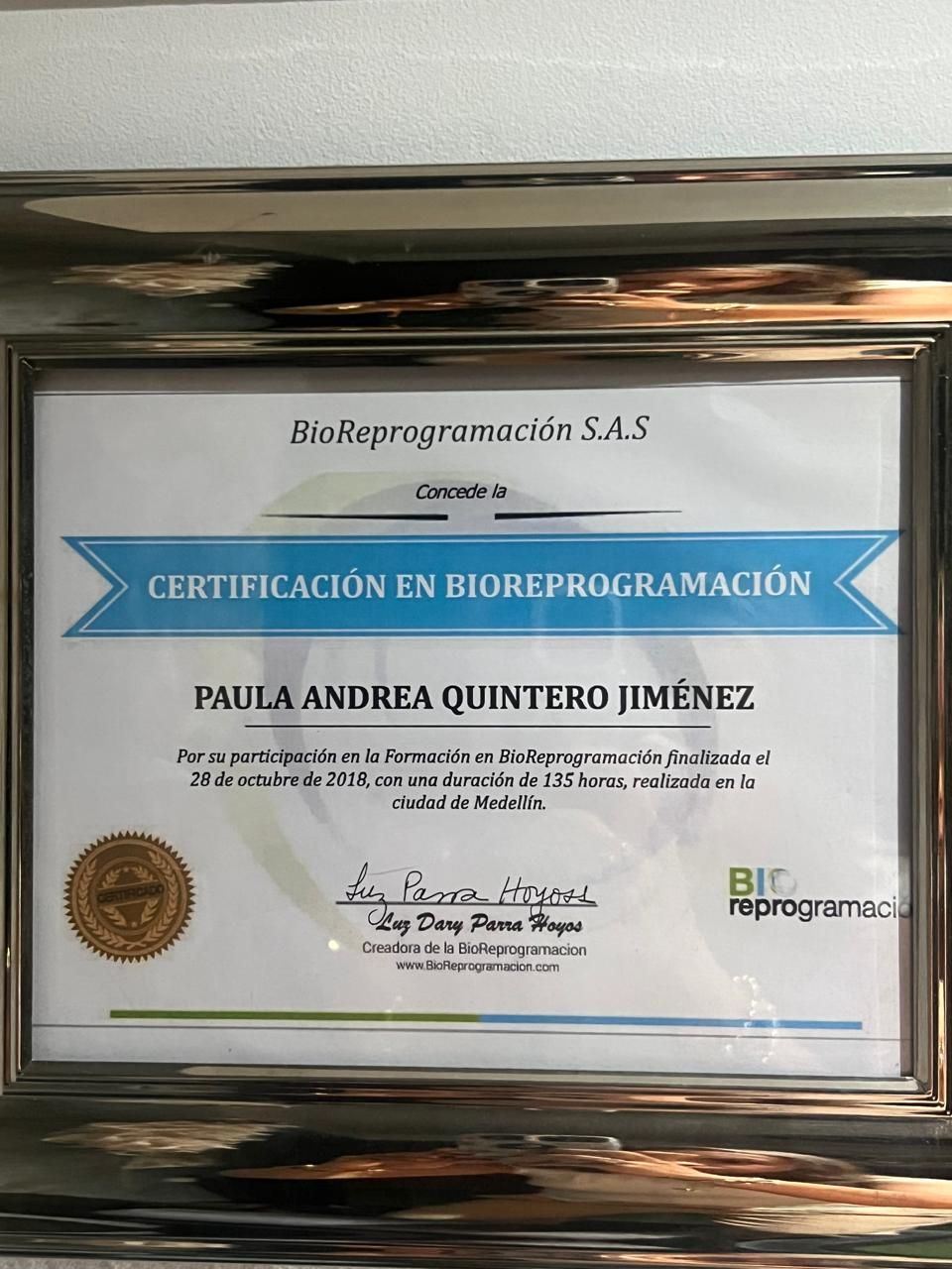 ¿Cuáles son las especialidades principales de Paula Andrea Quintero?Paula Andrea Quintero es Terapeuta complementario. Te mostramos algunos de los servicios que ofrece gracias a su trayectoria y su amplia experiencia: Visita Medicina Alternativa, Manejo en procesos de duelo, Biodescodificación Emocional (Bioneuroemoción), Terapias alternativas Biopuntura, Tratamiento contra la ansiedad, Manejo de migraña, Psicoterapia Familiar, Psicoterapia Individual, Terapia de pareja, Manejo integral de obesidad.