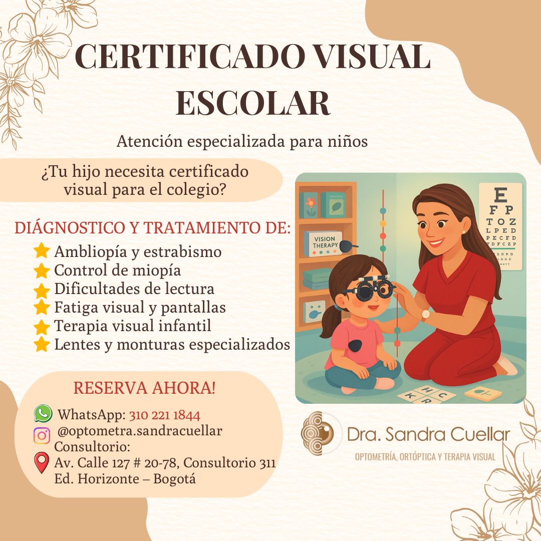 Soy Sandra Cuéllar, optómetra especialista en optometría pediátrica, ortóptica y terapia visual. Realizo valoraciones completas para niños desde los 2 años.
