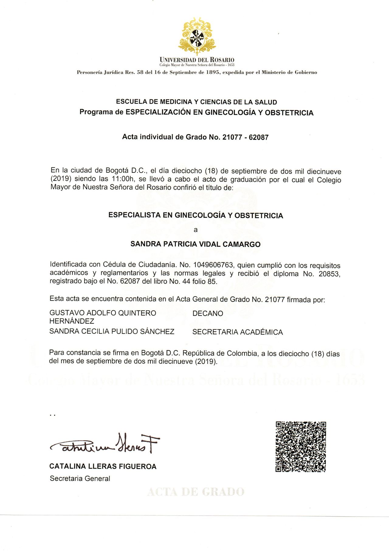 ¿Cuáles son las especialidades principales de Sandra Patricia Vidal Camargo?Sandra Patricia Vidal Camargo es Ginecólogo. Te mostramos algunos de los servicios que ofrece gracias a su trayectoria y su amplia experiencia: Diagnóstico y tratamiento de hemorragia uterina anormal , Extracción del DIU, Implante del DIU, Visita Ginecología y Obstetrícia, Visitas sucesivas Ginecología y Obstetrícia, Anticonceptivos, Ecografía transvaginal, Consulta médica de fertilidad, Consulta Prenatal Control, Consulta de menopausia.