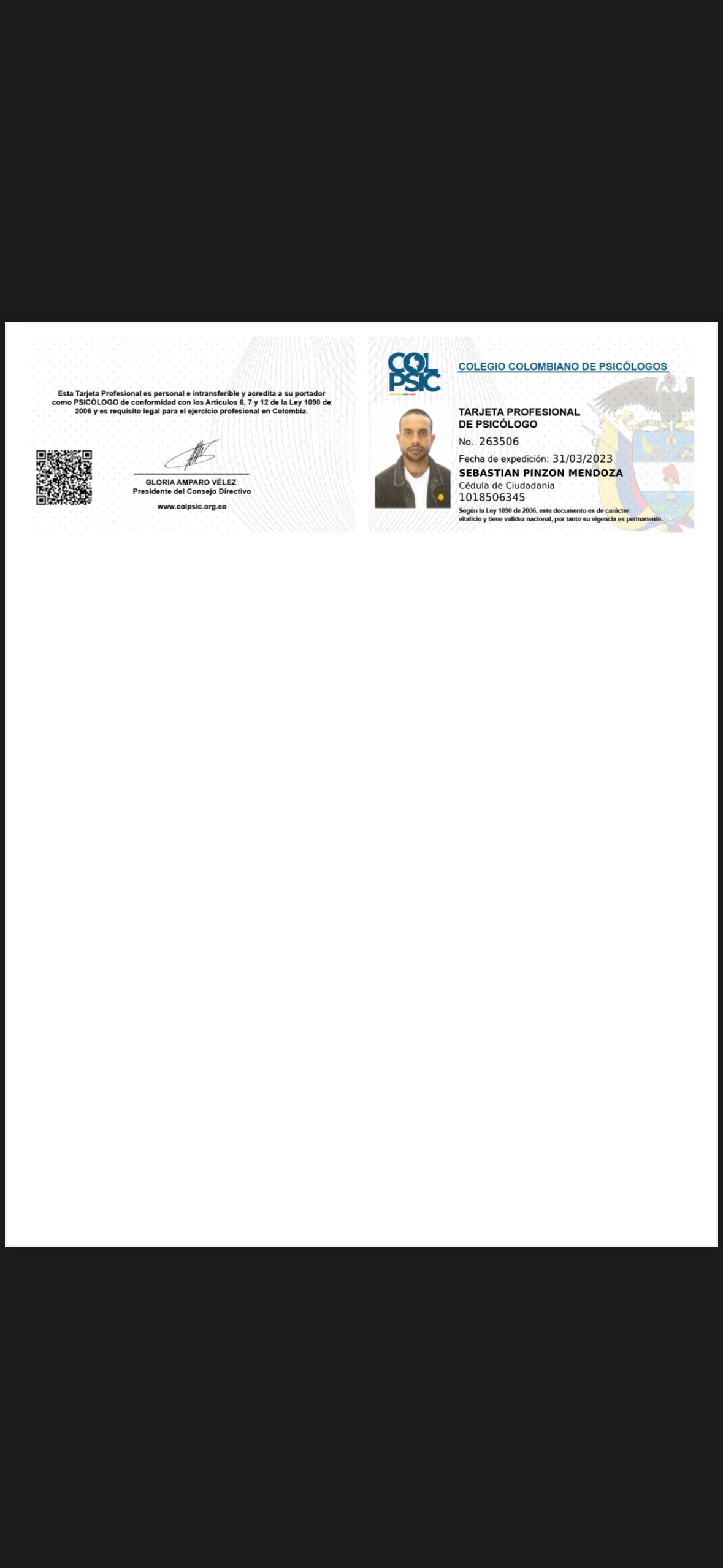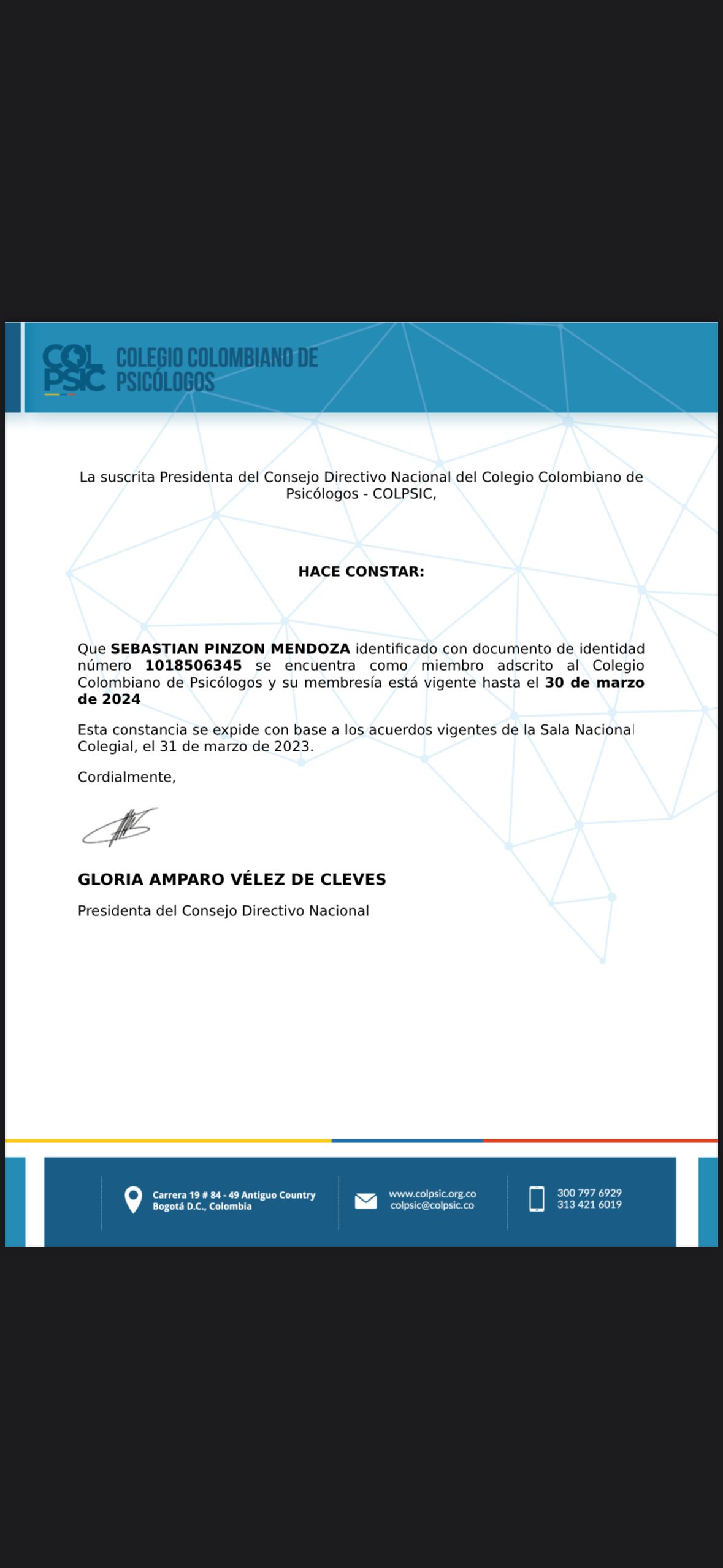 Soy Psicólogo con 5 años de experiencia en Psicología Clínica con enfoque Psicodinámico. He trabajado en colegios como el Sabio Caldas o el Gimnasio Los Robles, en el ala de Cuidados Paliativos del Hospital Universitario San Ignacio, en el consultorio psicológico de la Universidad Javeriana, y en consulta particular.