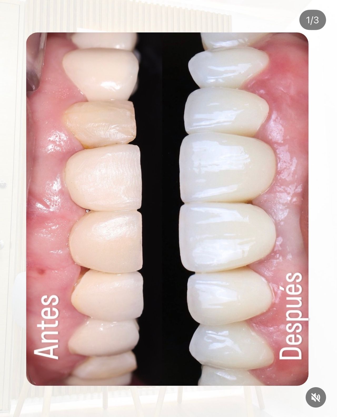 Coronas cerámicas naturales y estéticas con planeación digital. La foto del "antes" muestra unas coronas opacas, asimetricas sobre dientes con infección, la foto del "después" muestra salud de encias y coronas en cerámicas estéticas.