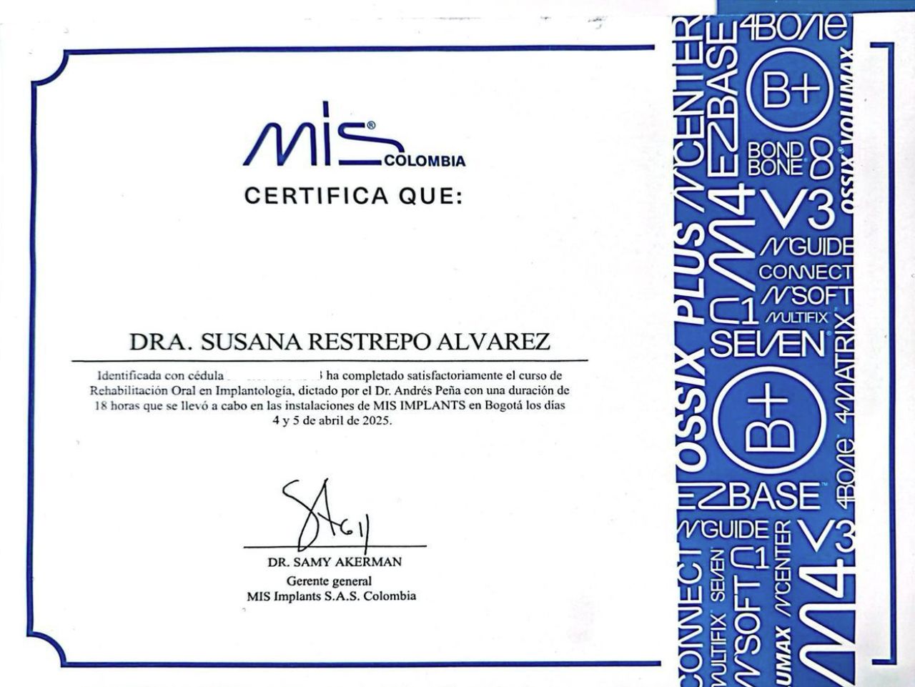 ¿Cuáles son las especialidades principales de Susana Restrepo?Susana Restrepo es Odontólogo. Te mostramos algunos de los servicios que ofrece gracias a su trayectoria y su amplia experiencia: Visita Odontología, Implantes dentales.