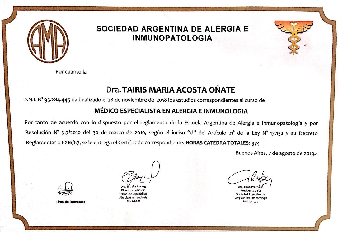 ¿Cuáles son las especialidades principales de Tairis Maria Acosta Oñate?Tairis Maria Acosta Oñate es Alergólogo. Te mostramos algunos de los servicios que ofrece gracias a su trayectoria y su amplia experiencia: Visita Alergia, Asma e Inmunología, Aplicación de Inmunoterapia, Prueba epicutánea de alergias (prueba de parche) con batería estándar, Prueba intraepidérmica de alergia con escarificación o puntura.
