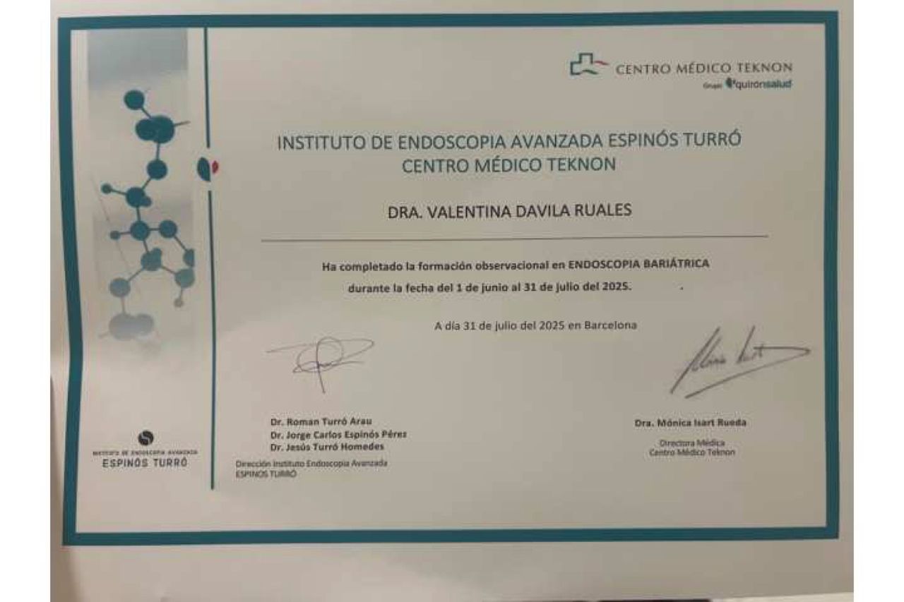 Cuento con formación en endoscopia digestiva y endoscopia bariátrica para el manejo de la obesidad, ofreciendo alternativas no quirúrgicas como parte de un enfoque integral y personalizado. Esto permite acompañar a los pacientes en su proceso de pérdida de peso de forma segura y con seguimiento médico.
