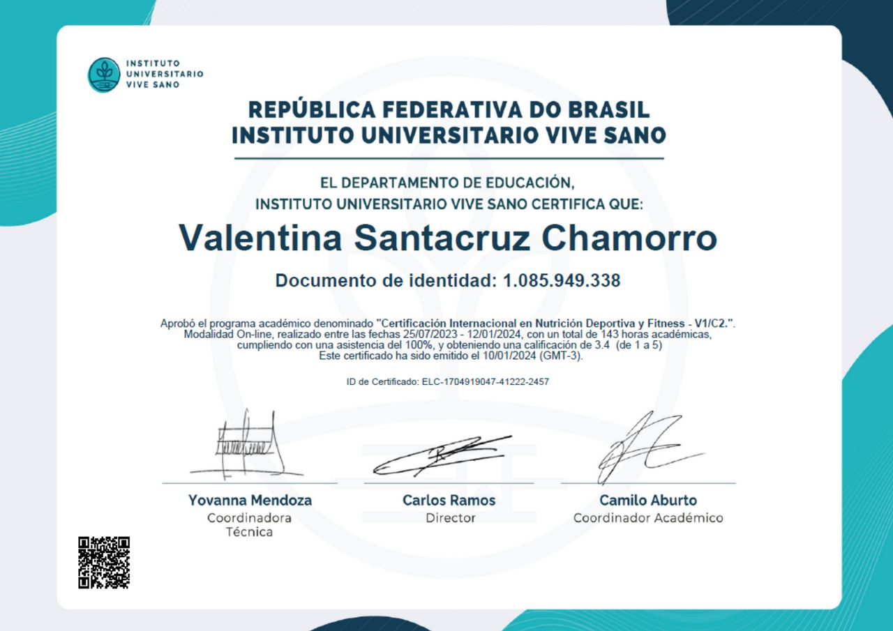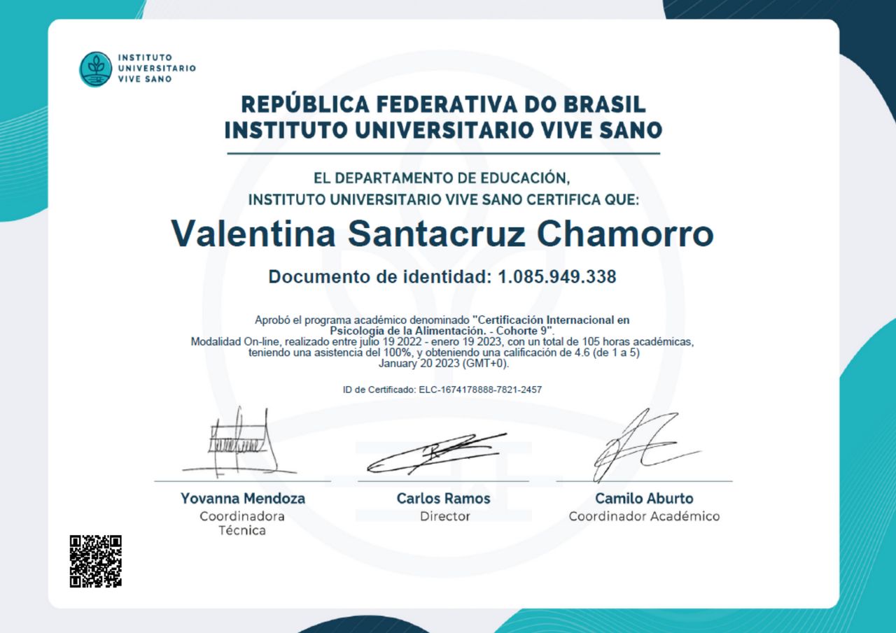 ¿Cuáles son las especialidades principales de Valentina Santacruz?Valentina Santacruz es Nutricionista. Te mostramos algunos de los servicios que ofrece gracias a su trayectoria y su amplia experiencia: Asesoría para la alimentación complementaria, Asesoría para la alimentación de deportistas, Asesoría para la alimentación infantil, Asesoría nutricional, Nutrición deportiva, Valoración nutricional del deportista, Consulta del paciente con obesidad, Valoración nutricional oncológica, Valoración nutricional en pacientes veganos y vegetarianos, Consulta de nutrición.