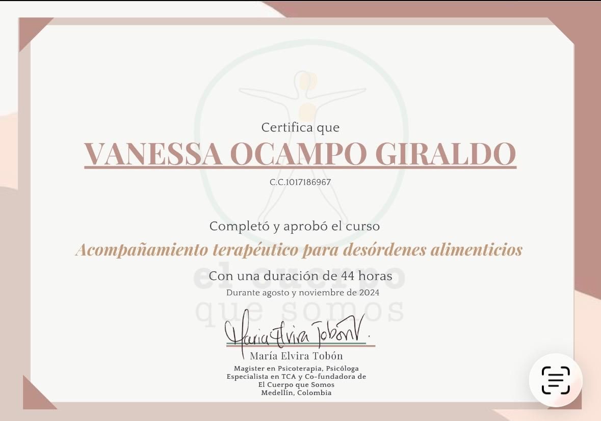 ¿Cuáles son las especialidades principales de Vanessa Ocampo Giraldo?Vanessa Ocampo Giraldo es Terapeuta complementario. Te mostramos algunos de los servicios que ofrece gracias a su trayectoria y su amplia experiencia: Visita Medicina Alternativa, Psicoterapia Individual, Consulta en línea.