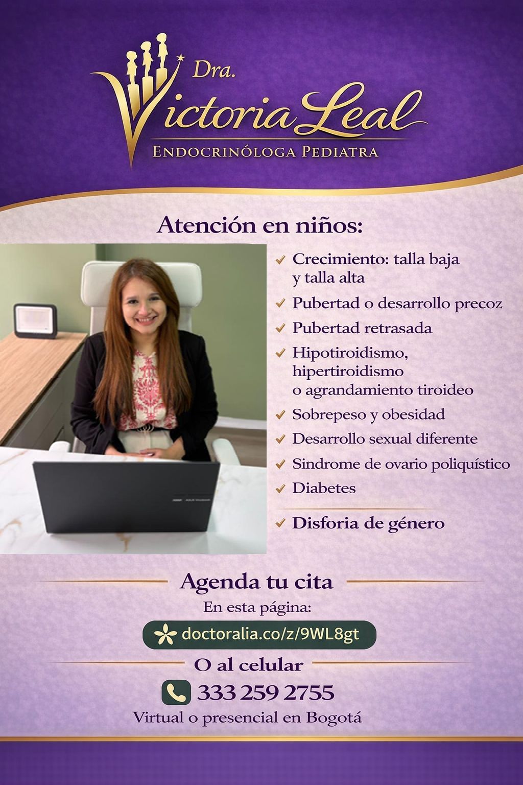 La Dra. Victoria Leal Desde mi experiencia, es una endocrinóloga pediatra excepcional. Tiene un conocimiento muy sólido y una mirada verdaderamente integral, pero lo que más la destaca es su calidad humana. Se toma el tiempo de escuchar, explica con claridad y hace que tanto los niños como sus familias se sientan tranquilos y acompañados durante todo el proceso. Su actitud cercana y empática genera mucha confianza, y se nota el compromiso real que tiene con el bienestar y el desarrollo de sus pacientes. La recomiendo con total tranquilidad.