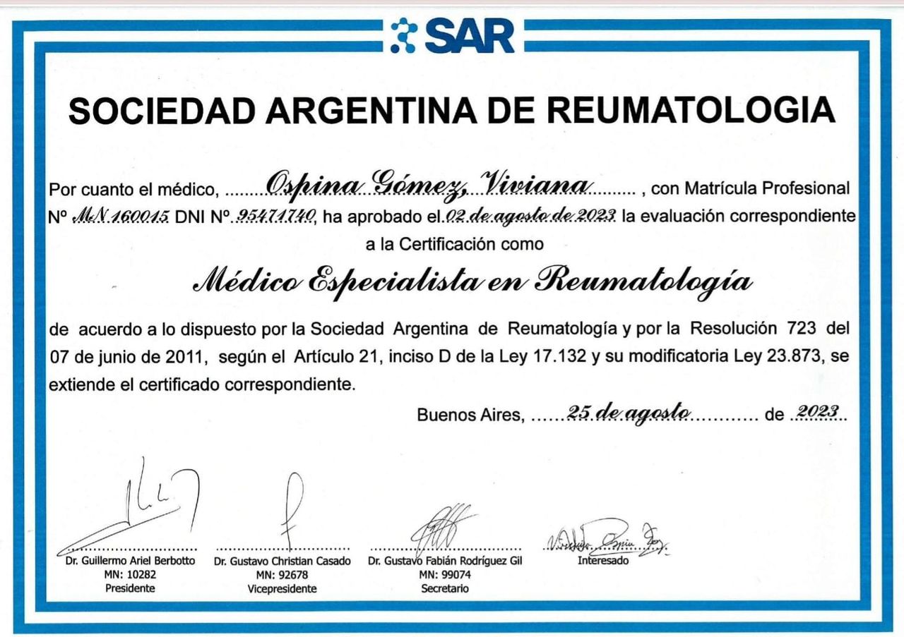 Llevo varios años con la doctora Viviana Ospina siendo paciente por Reumatología y puedo decir que gracias a sus conocimientos médicos y calidad humana como médico especialista he obtenido los tratamientos oportunos y adecuados para mi diagnóstico.