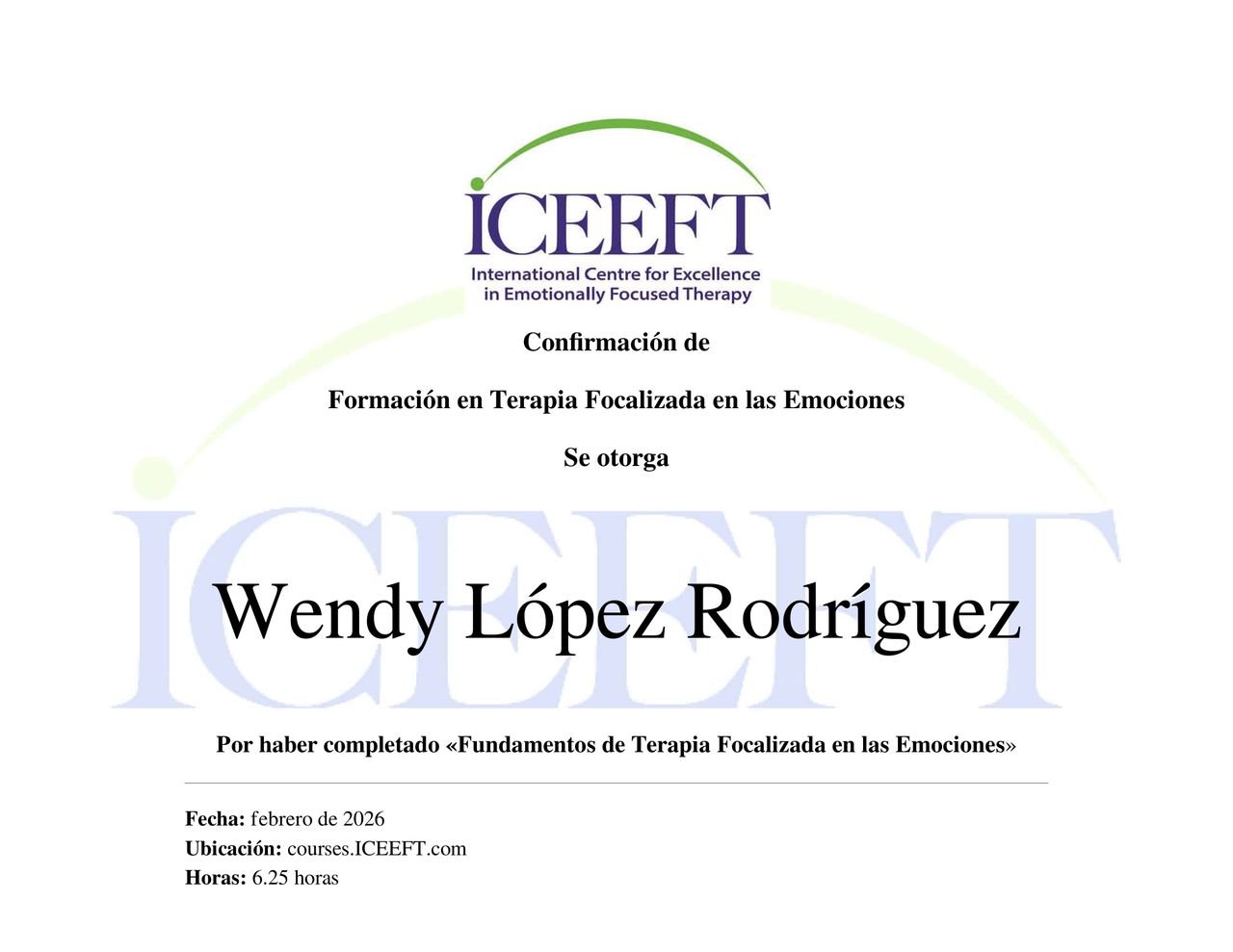 Certificada en Terapia Focalizada en las Emociones (EFT) por el International Centre for Excellence in Emotionally Focused Therapy (ICEEFT, Canadá), fundado por Sue Johnson.
