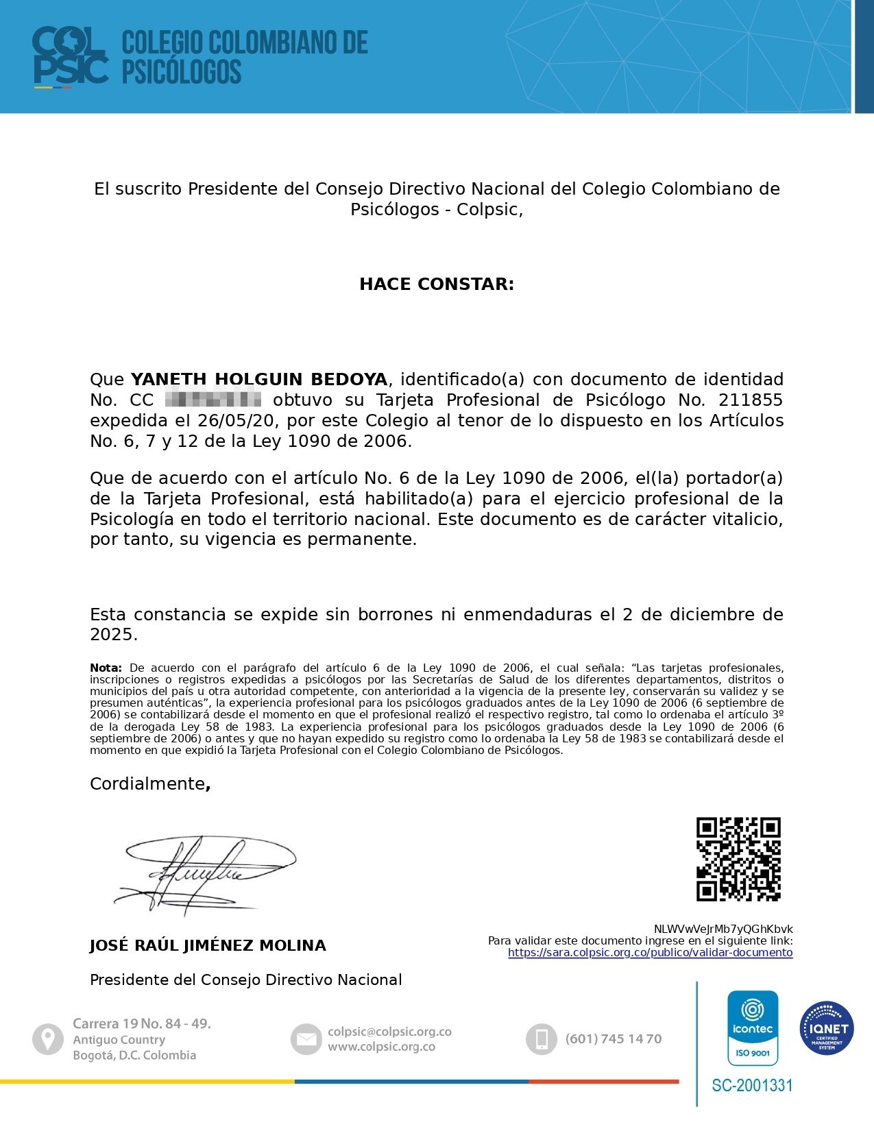 ¿Puedo hacer la visita con Yaneth Holguín Bedoya en línea, sin tener que desplazarme hasta su consultorio?Sí, Yaneth Holguín Bedoya ofrece consulta de forma remota. Solo tienes que seleccionar "consulta en línea" cuando vayas a reservar cita desde el calendario, y así podrás ver las fechas y horas disponibles.