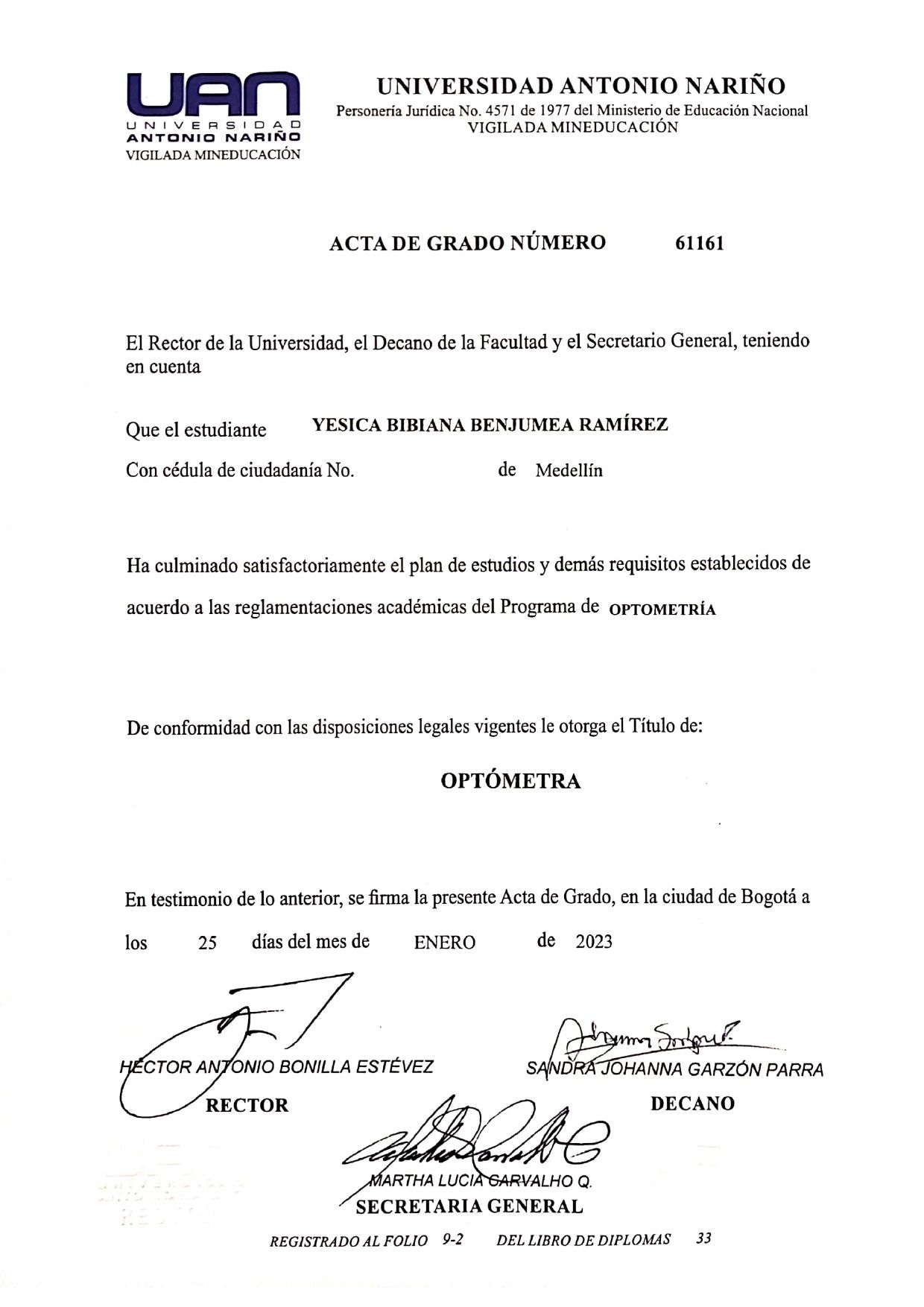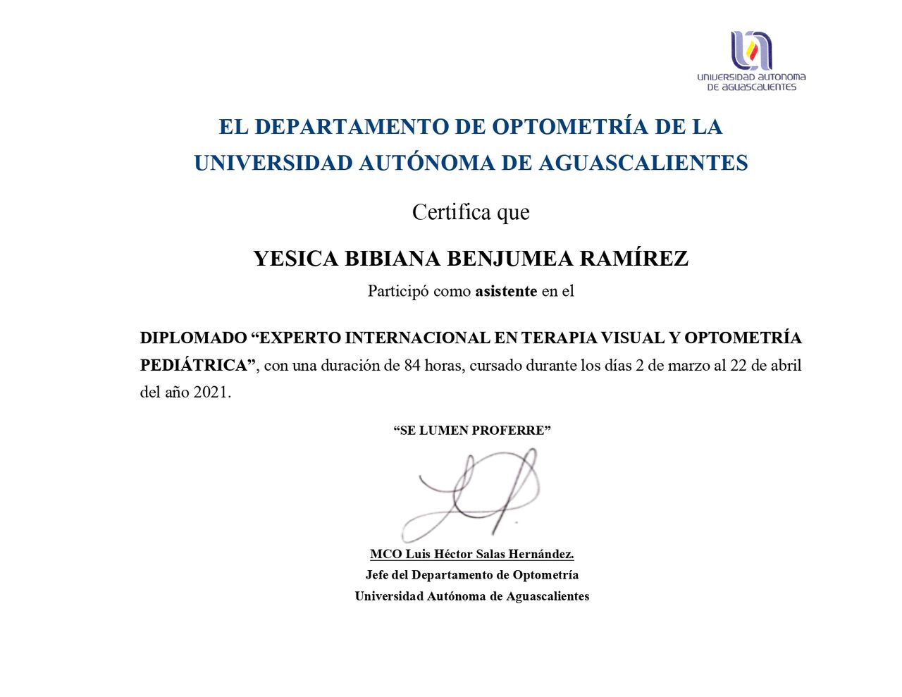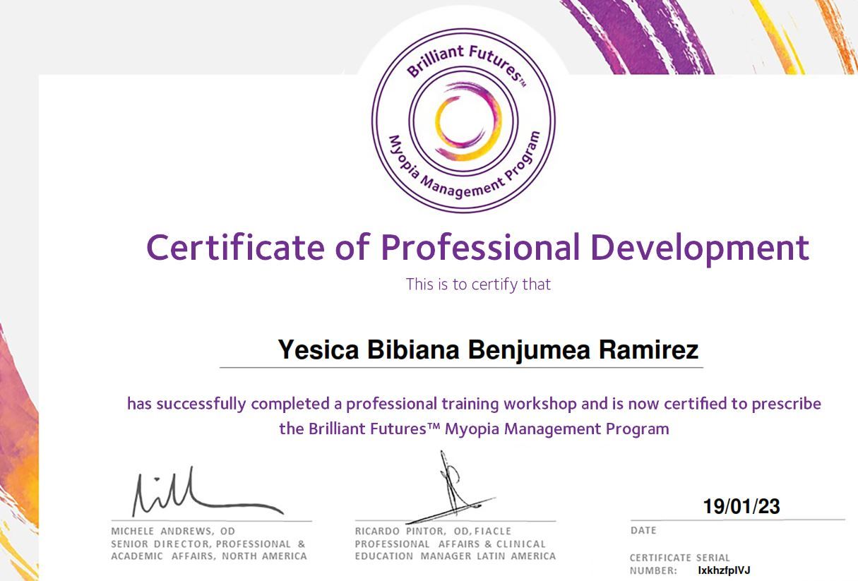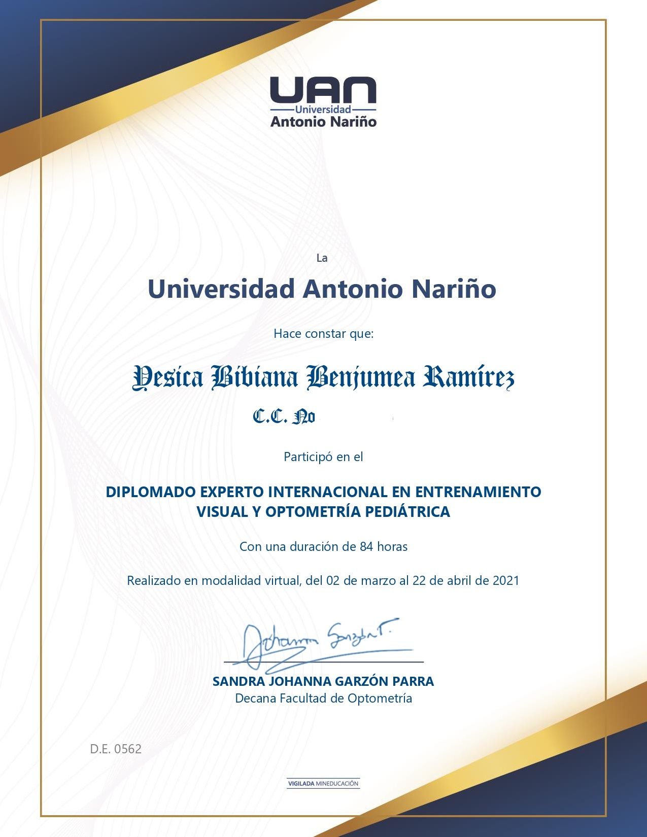 ¿Cuáles son las especialidades principales de Yesica Bibiana Benjumea Ramirez?Yesica Bibiana Benjumea Ramirez es Optómetra. Te mostramos algunos de los servicios que ofrece gracias a su trayectoria y su amplia experiencia: Visita Optometría, Adaptación de lentes de contacto, Spa de Ojos.