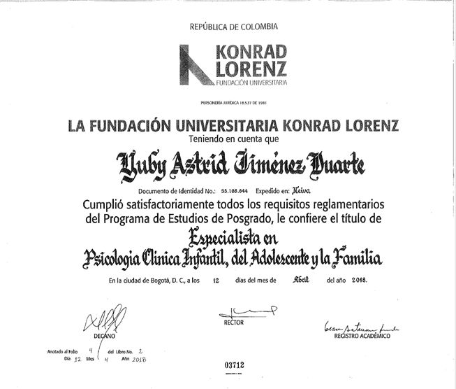 ¿Cuáles son las especialidades principales de Yuby Astrid Jiménez Duarte?Yuby Astrid Jiménez Duarte es Psicólogo. Te mostramos algunos de los servicios que ofrece gracias a su trayectoria y su amplia experiencia: Visita Psicología, Asesoría psicológica y psicoeducación, Coaching Familiar, Consulta psicológica infantil, Grupos de apoyo para pacientes con ansiedad, Pautas de crianza, Pruebas psicotécnicas, Salud mental empresarial, Terapia Breve, Visita domiciliaria Psicología.