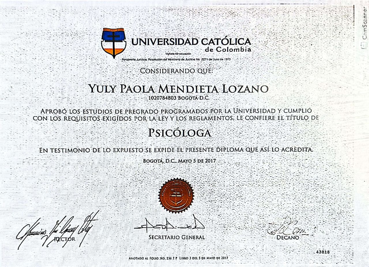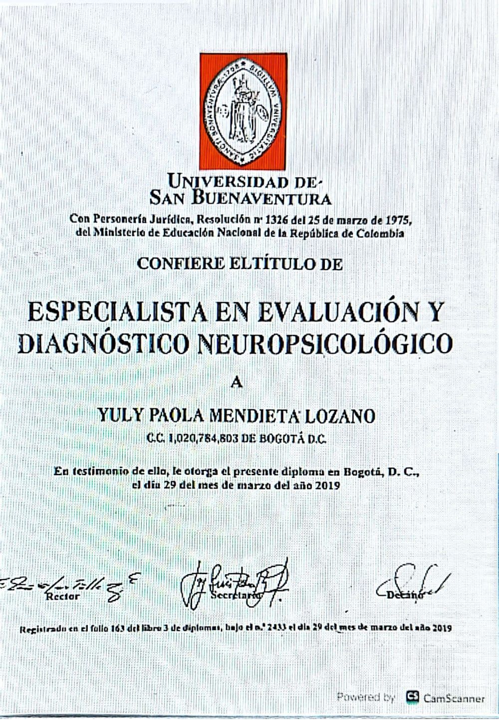 ¿Cuáles son las especialidades principales de Yuly Mendieta Lozano?Yuly Mendieta Lozano es Psicólogo. Te mostramos algunos de los servicios que ofrece gracias a su trayectoria y su amplia experiencia: Consulta psicológica infantil, Rendimiento académico, Psicoterapia Infantil, Test de inteligencia, Neuropsicología, Consulta en línea.