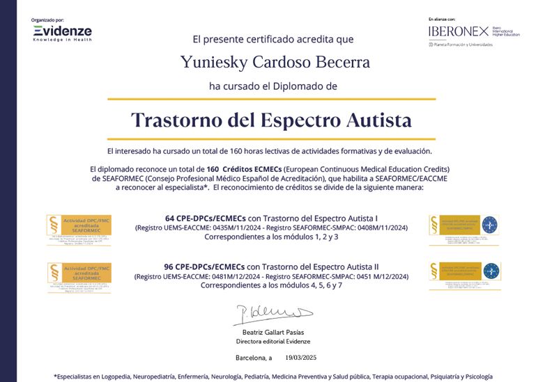 Soy médico Especialista en Psiquiatría, Msc. Tratamiento Cognitivo Conductual Adicciones. Diplomado en Atención Integral a Personas Neurodivergentes. Egresado de la Universidad de Ciencias Médicas de La Habana Cuba y la Universidad Tecnológica de España. Experiencia en el campo de la Psiquiatría desde el año 2012, con experiencia específica en el tratamiento cognitivo conductual adicciones desde el 2018. Con Resolución a ejercer la Profesión avalado por el Colegio Médico Colombiano. Caracterizado por el trato hacia el paciente con Dignidad y Humanismo.