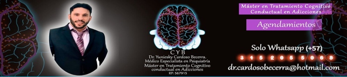 ¿Cuáles son las especialidades principales de Yuniesky Cardoso Becerra?Yuniesky Cardoso Becerra es Psiquiatra. Te mostramos algunos de los servicios que ofrece gracias a su trayectoria y su amplia experiencia: Consulta y seguimiento psiquiátrico a distancia, Prevención del consumo de sustancias psicoactivas, Evaluación psicológica para cirugía bariátrica y estética, Consulta psiquiátrica y psicoterapéutica, Atención integral en adicciones y comportamiento, Consulta en línea, Visita Psiquiatría, Tratamiento del alcoholismo (problemas con el alcohol), Terapia cognitiva del comportamiento (TCC), Tratamiento para la depresión.